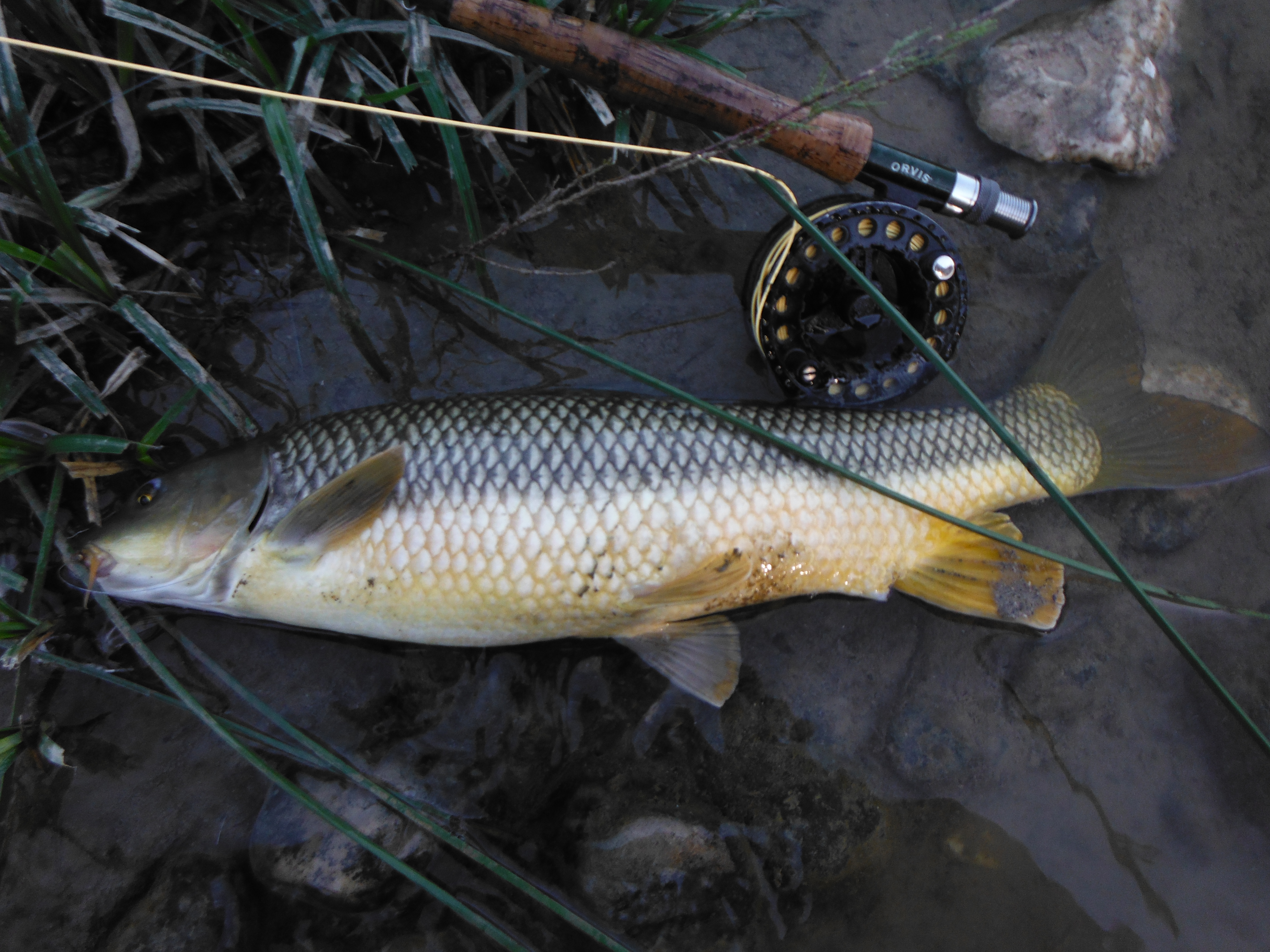 I was hoping to find a few barbel in a shallow run which has proven to be pretty reliable. Unfortunately they seemed to have abandoned the shallows but don´t appear to have wandered far. They were just downstream and I managed to catch a couple of lovely fish, around three pounds apiece. I did not see either fish but struck when the end of the fly line was pulled.
