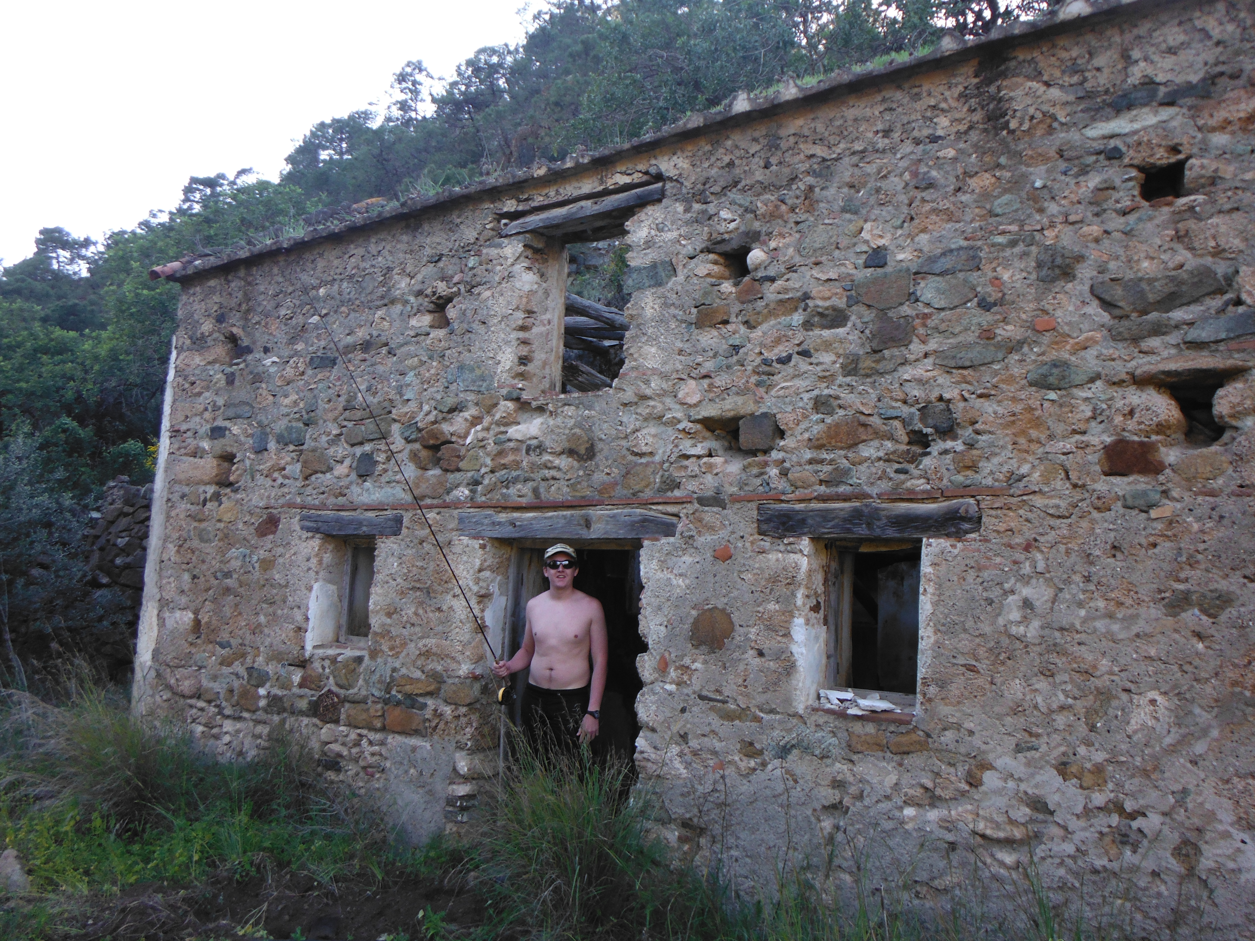 We pulled up to this abandoned stone building. Wild boar have been rooting around here recently and you can see the disturbed ground all around.