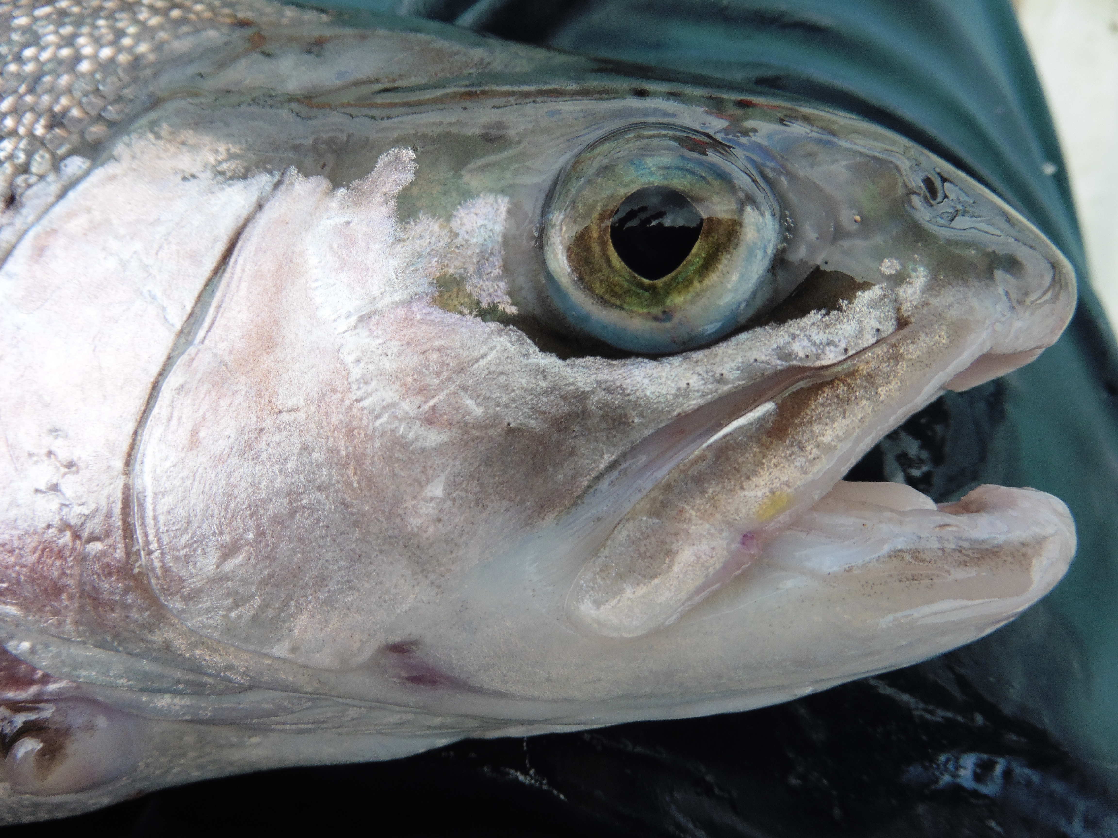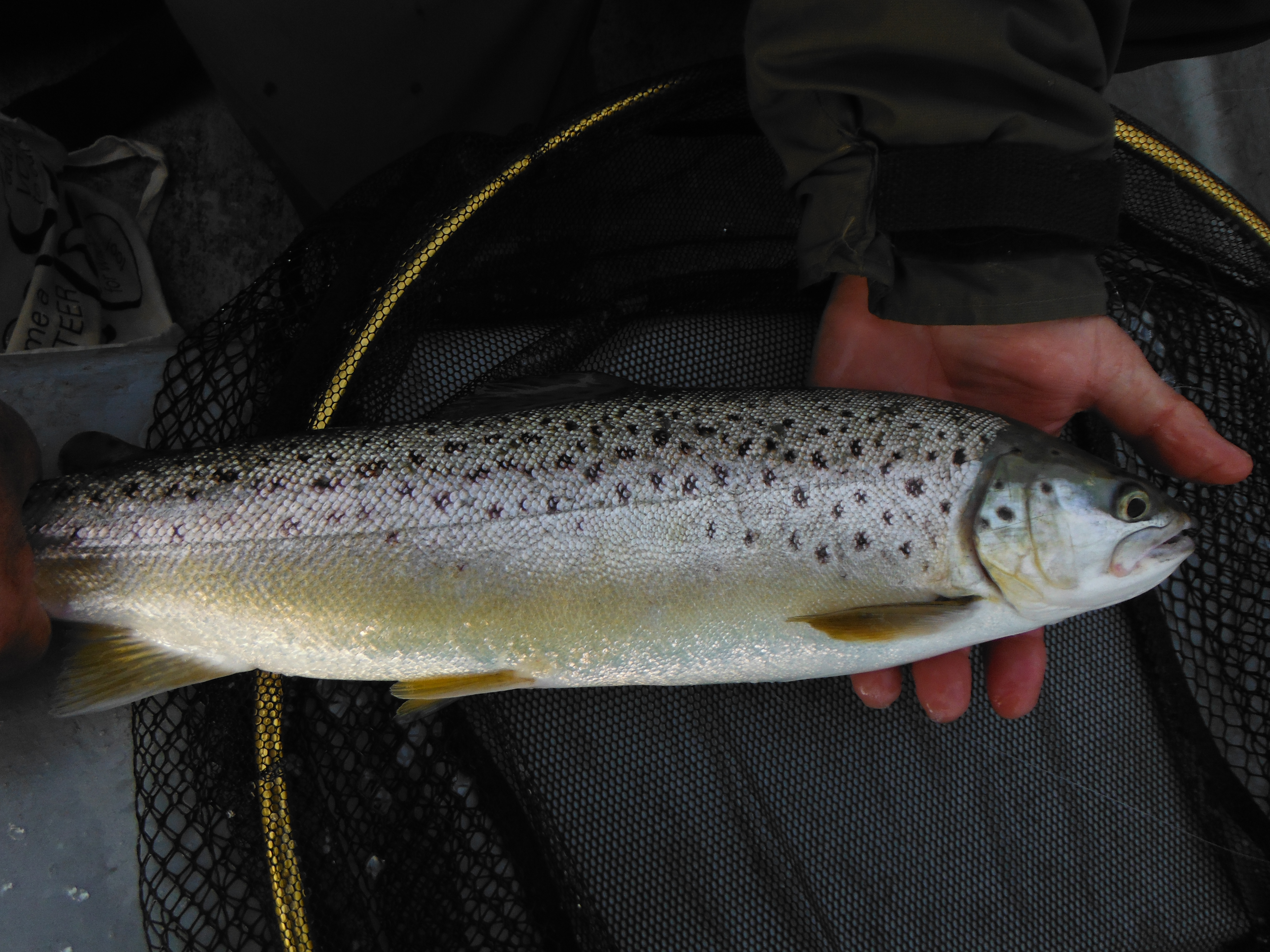 This fish was missing a pectoral fin and the wear on the upper lobe of the tail suggested that it was probably a recently-stocked fish. So while Harry was “bagging up” I managed no better than to snag a mildly deformed “stockie”