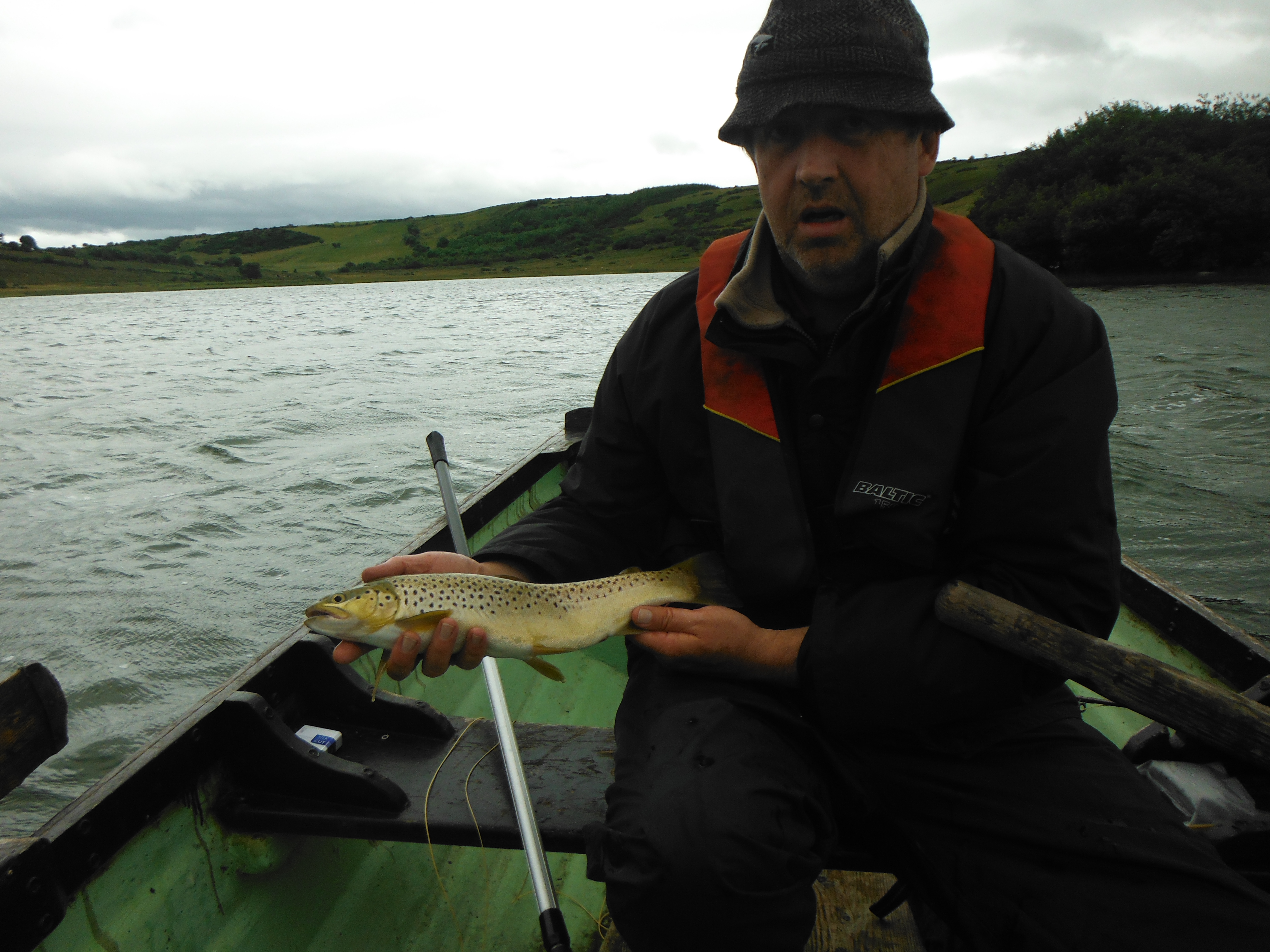 Tom is a nice guy. He didn´t give us any grief about taking the boat out and had good things to say about Sean´s dog, Meg. He was into dogs himself and has represented the country at sheep dog trials and was a judge on One Man and his Dog. He told us the lough was fishing well and so it proved. We managed 9 trout between us, 5 browns and 4 rainbows and all were returned to the water.