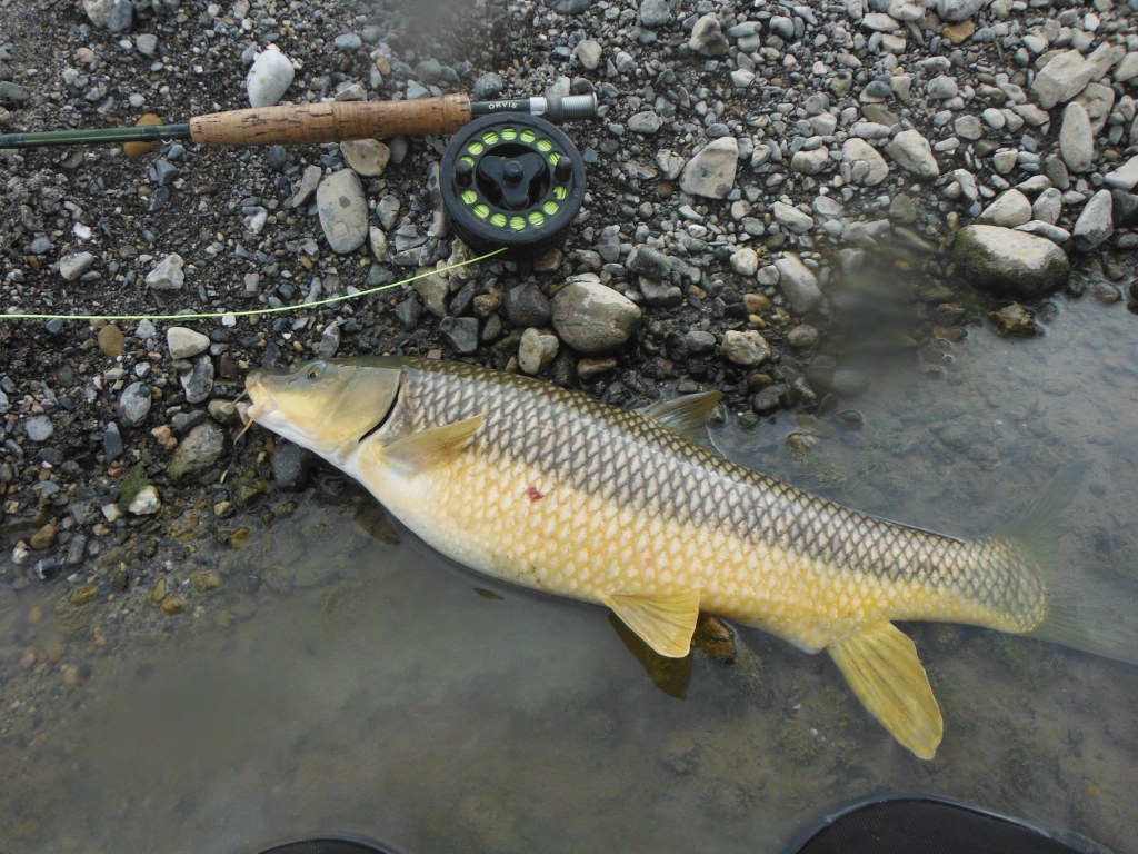 The flies Sean was tying were to serve to catch some trout in his local river in Ireland but the river was running pretty high and so his nymphs were heavily weighted. My own nymphs were to fish “my” river for barbel here in Spain. The stretch I like is pretty clear at present, and shallow too, and so I err on the small side when tying. I know that the barbel would be spooked if nymphs are too large or gaudy or make too much noise when they plop into the water.