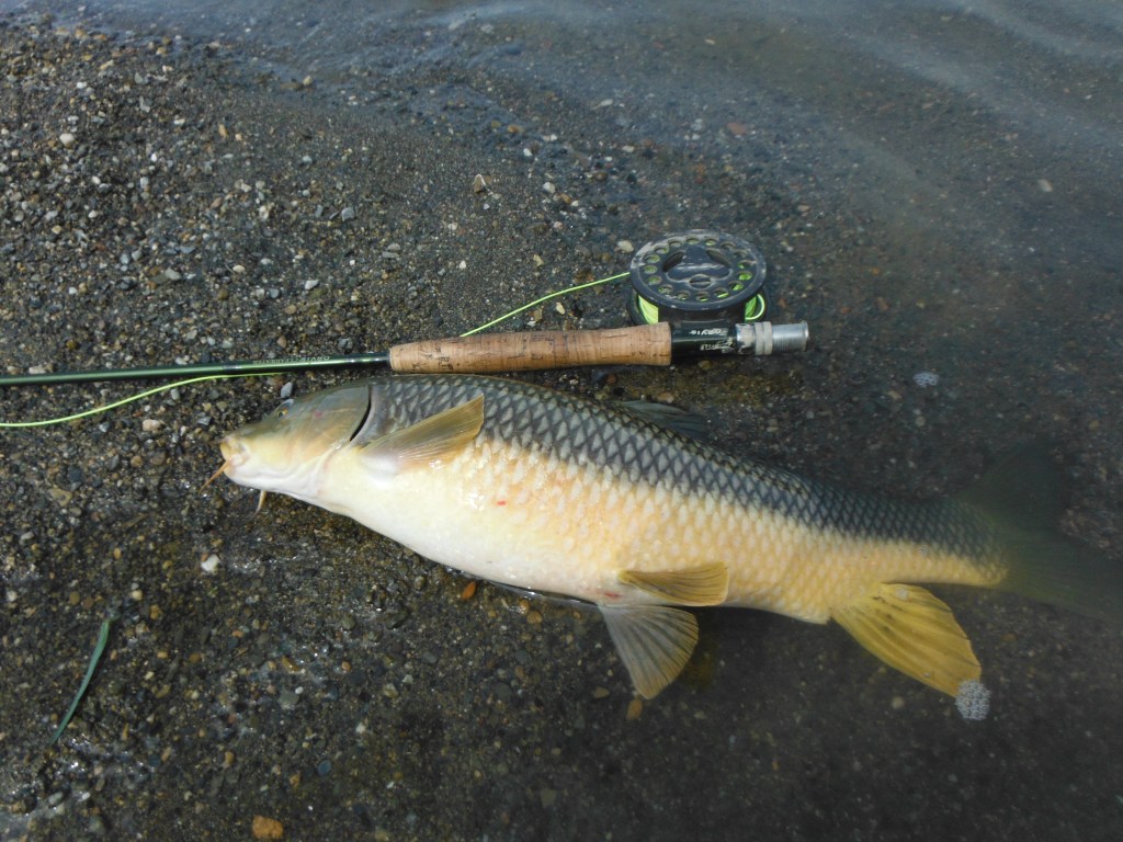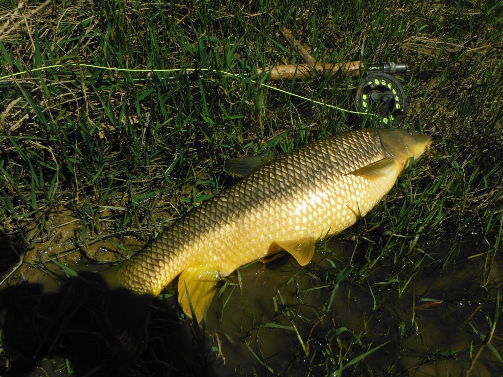 The fish below came from the Río Grande. Again, there were no signs of carp. This was one of a few fish on the shallow edge of a fast run as it spilled into a pool. These fish were on the opposite side of the river. The water was so shallow and fast that it was possible to get reasonably close, but the cast needed was upstream and beyond the fish and then mended upstream to allow the nymph to lead the way and to have enough time to sink. I worked my way through a lot of casts before I got it right but was well rewarded in the end.