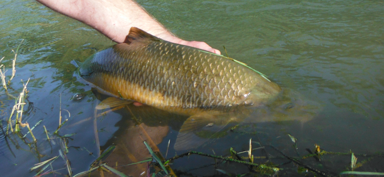 The fish surged upstream and I figured that my best bet was to make my way into the river and follow it and so that´s what I did. I have been in situations like this before where the barbel have pulled off their world famous party trick of transferring the fly to a submerged branch. They are real experts at this. The first thing you notice is that the line is pointing at one spot and that the surging force of the fish has been replaced by an unmoving resistance. Naturally, I was very wary of this happening again and kept the fish on a very short line and kept it away from the plant growth of the margins. The river did not seem to be much deeper than knee depth but I saw nothing of the fish until our little waltz had glided us 20 or 30 metres downstream to where I had a reasonable shot at beaching it.
