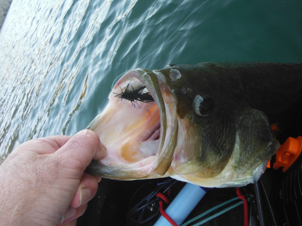 I threw my bucktail monster into to margins and let it sit for a good while before I started to retrieve. Bass are often seem to need a bit of time to investigate something which shows up unexpectedly. I forced myself to be patient. I must have cast this thing hundreds of times. And no interest was shown at all. One cast followed another and each time that fly was ignored. Every cast, except one.