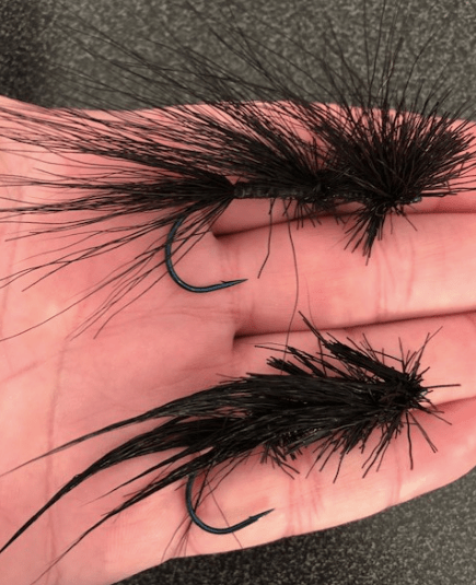 Or at least that is what I persuaded myself might be the case. By the time I sat down at the vise the evening before our adventure, I had myself become a character of fiction – Victor Frankenstein. It was not a fly I needed to create. If I wanted to catch one of these shady figures from the underworld, I needed a monster. And I succeeded in creating not just one, but two! When I was done I looked at my handiwork and realised I had breathed life into two ugly and horrible creations. There was little to them: bushy black bucktail tied onto the biggest hooks I could see lying around.