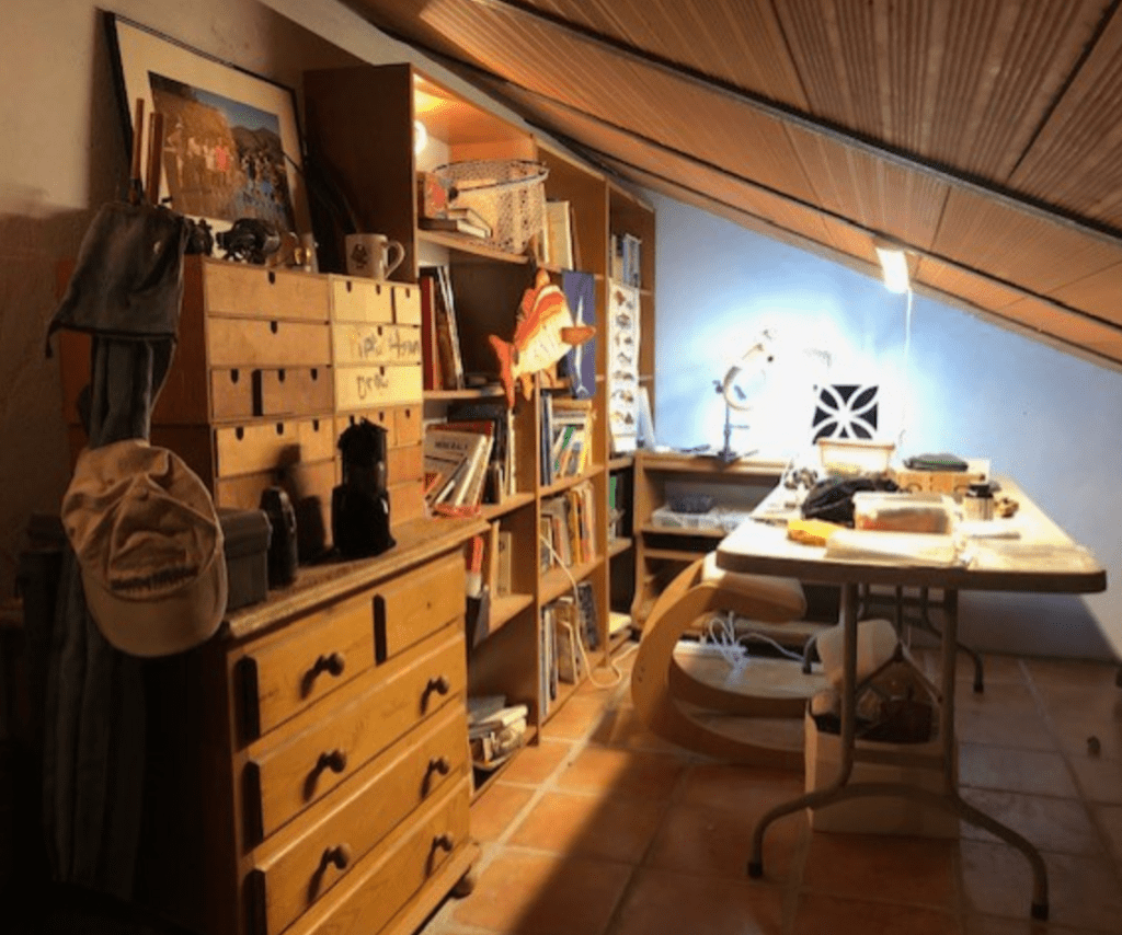 It is now a few weeks on and my cave is shaping up nicely. I fixed up some lights and found a nice big table to help me to resurrect my interest in painting. On another little compact table there is a vice for tying flies. And there is comfy chair for reading. I am sitting on that chair right now as I type these words. In the background, from a bluetooth speaker on my fly tying desk, John Hiatt is singing Adios to California.