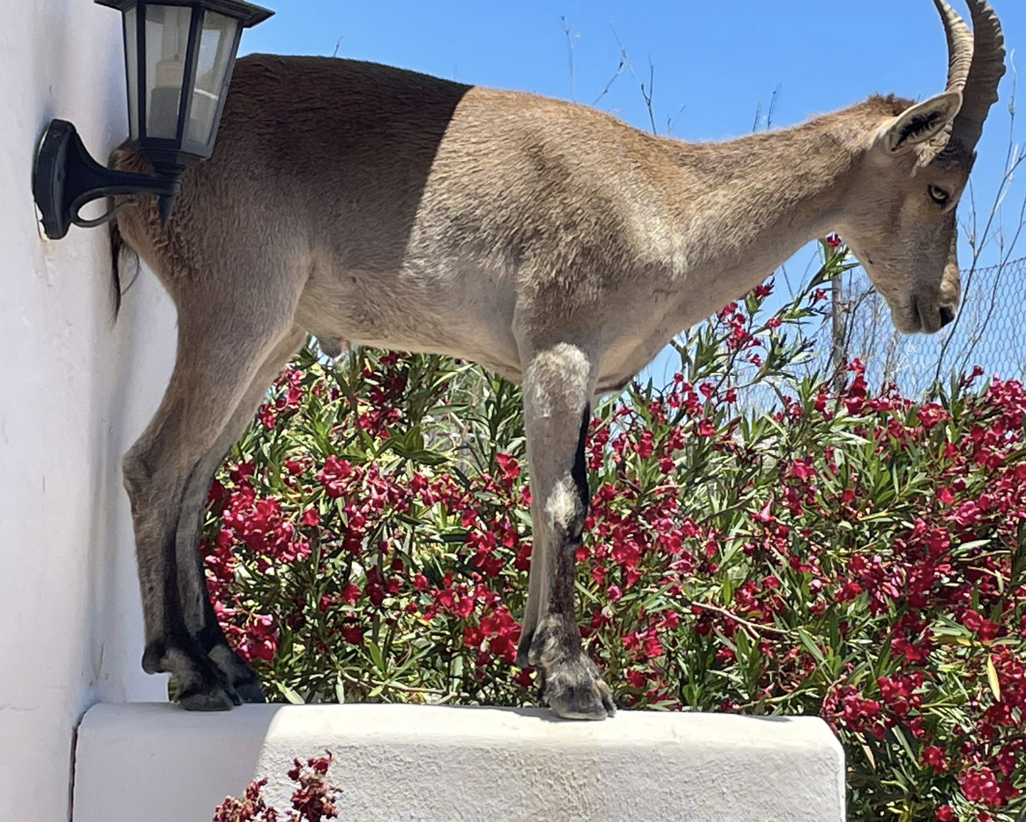 Yesterday we returned from the coast with some shopping in the back of the car and, as we normally do, went to and fro a couple of times between the car and the house carrying the bits and pieces we picked up. It was only as the last of these short errands were completed that I glanced over to a wall at the end of the house and noticed a mountain goat standing on it. It seems likely that it had been standing there all along.