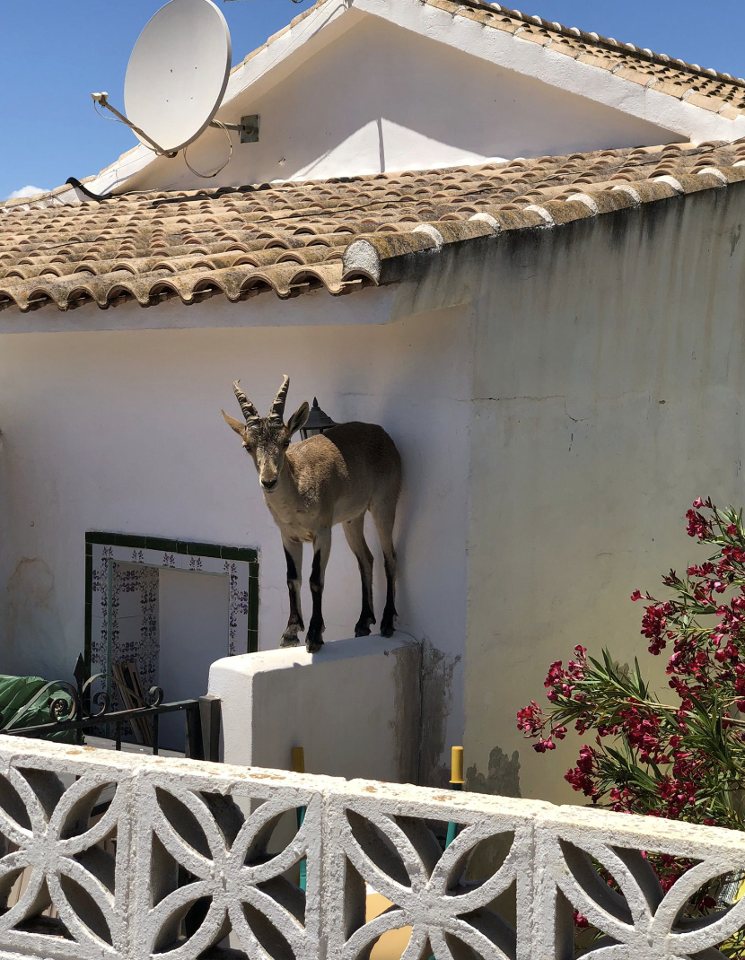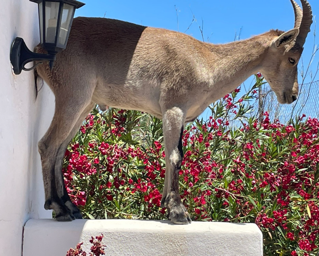It is not altogether unusual here to find the odd surprising animal putting in an appearance. We have had an Egyptian mongoose slip into the heavy growth in the lower part of our little plot of land in the past and just a couple of weeks ago a griffin vulture found itself in a spot of bother just down the road and the bird people showed up to rescue it. But in the campo where we live a mountain goat really is something special and, In twenty years of living here, we have not seen one before.