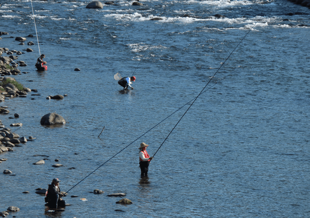 The fisherman swims or guides his live fish in a manner to search the water in front of him. If the baitfish swims too close to an ayu on its private patch of riverbed, it will be aggressively charged and the fish defending its homestead is likely to be hooked on the trailing treble hook. If all goes to plan the fish that had been acting as the “lure” is discharged of duty and placed into a container attached to the angler where he keeps his catch alive. The caught fish is then attached to become the target for the next ayu. Because the fish are small, a fisherman aims to raise the rod and swing both fish into the landing net. A Skilful ayu fishermen in this way can catch up to 50 or so fish in a day having started with only one live bait.