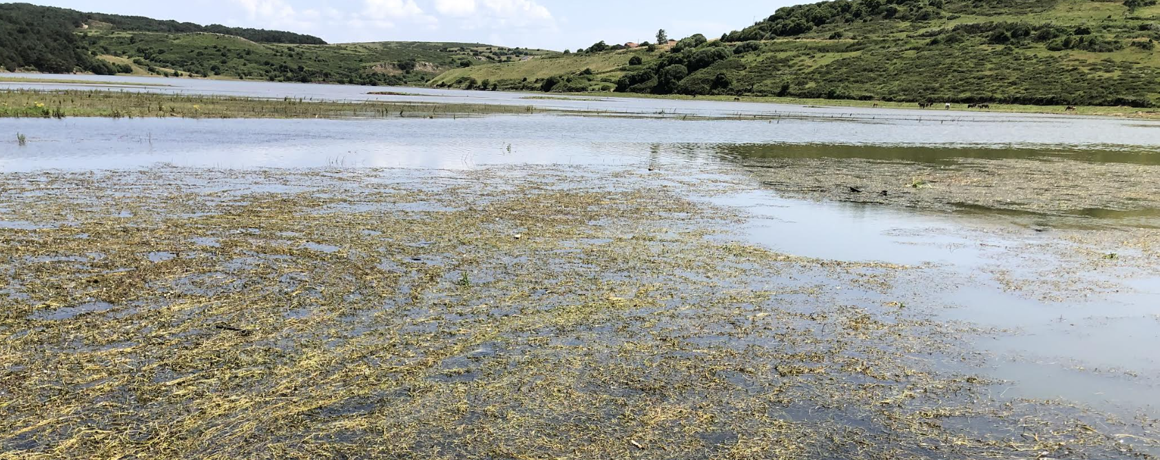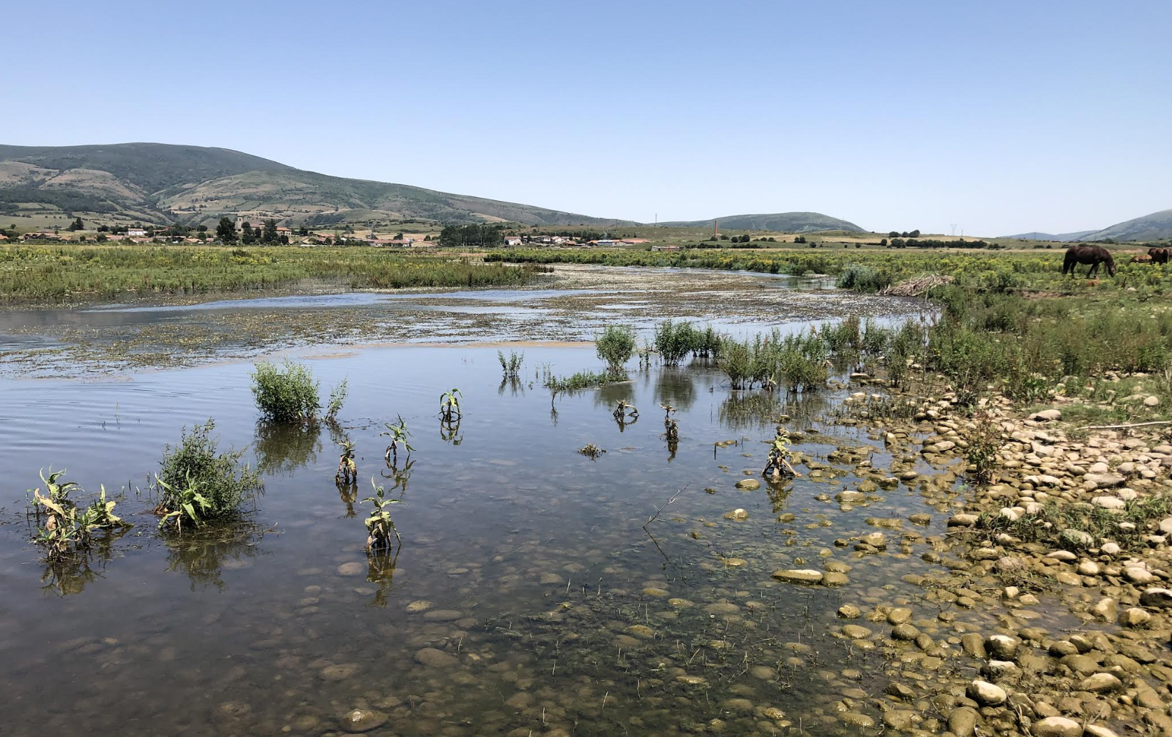 At the river inlet into the Embalse del Ebro reservoir the Ebro splits into two channels, each heavily weeded up in places but the clear water pushes through the weed growth, often in clear seams revealing the stony substrate beneath. Both flows converge before the water flows into a narrow tongue which extends to the west from the main body of the reservoir. From above it looks as though the embalse had extended an arm to greet the inflowing river that sustains it.